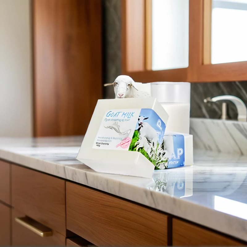 Goat Milk Soap Bars. Diperkaya dengan susu kambing yang kaya akan vitamin dan mineral, sabun ini membantu menjaga kelembapan alami kulit dan cocok untuk kulit sensitif. Membantu menjadikan kulit lebih halus, lembut, dan ternutrisi setiap hari.